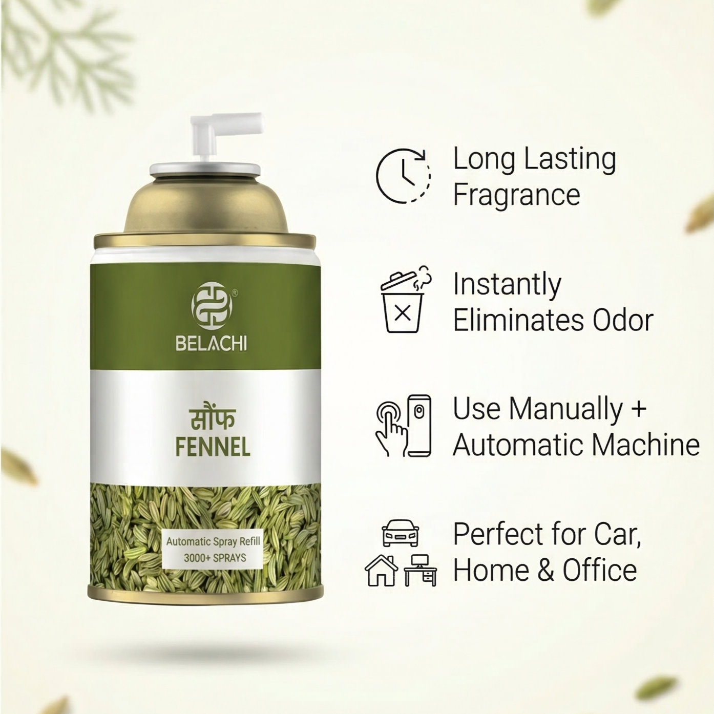 "Lets treat yourself with richness of prefect freshness!!". Enjoy this sensational extraordinary experience that you will be forced to use it again and again. "BELACHI FENNELAIRFRESHNER" will bring to close you in a veil of luxurious fragrance and caress your senses with a mighty floral soft touch. The luxurious character of this magical airfreshners offers a magical experience for you and the people surrounded by you who will shower you with compliments.